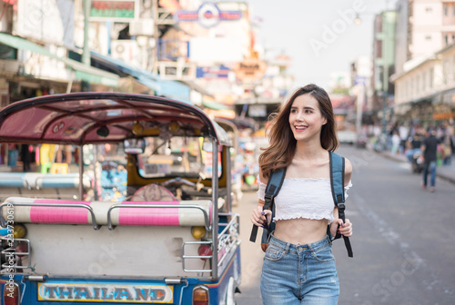 Young Woman Walking The Famous Backpacker Street Khao San In Bangkok