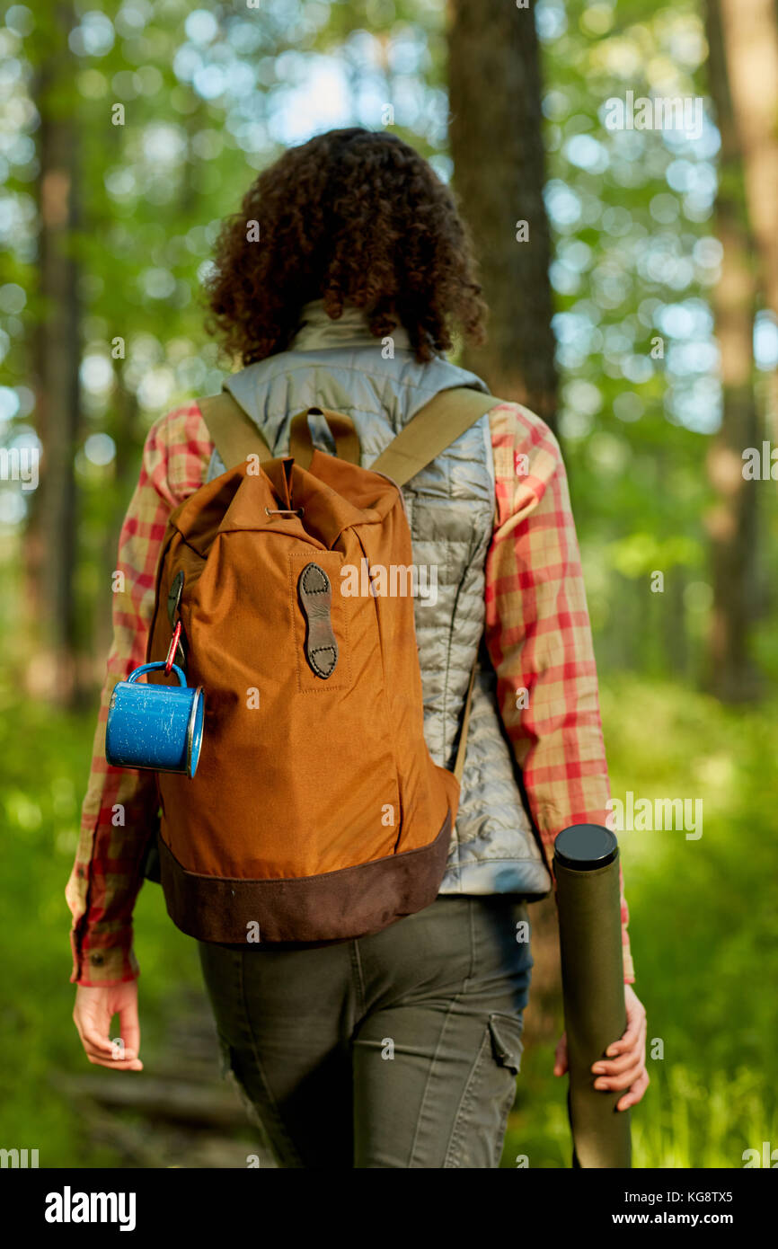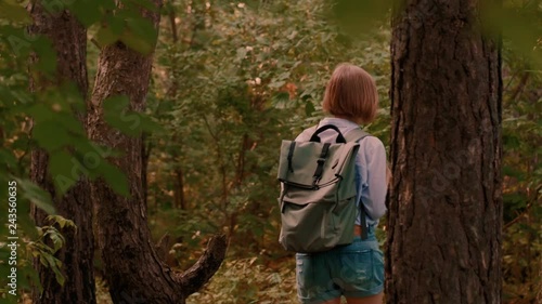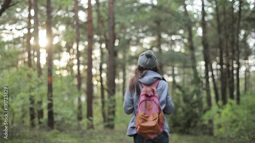 Backpacker Teen Girl In Forest View From Behind Walks Looking At