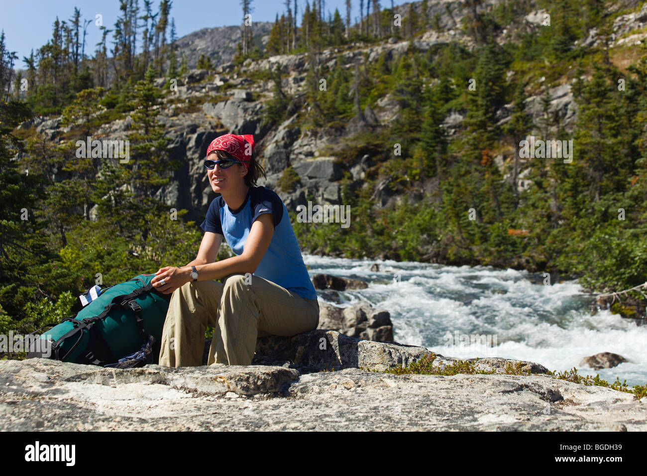 Young Woman Hiker Backpacker Sitting On Rock Resting Moose Creek