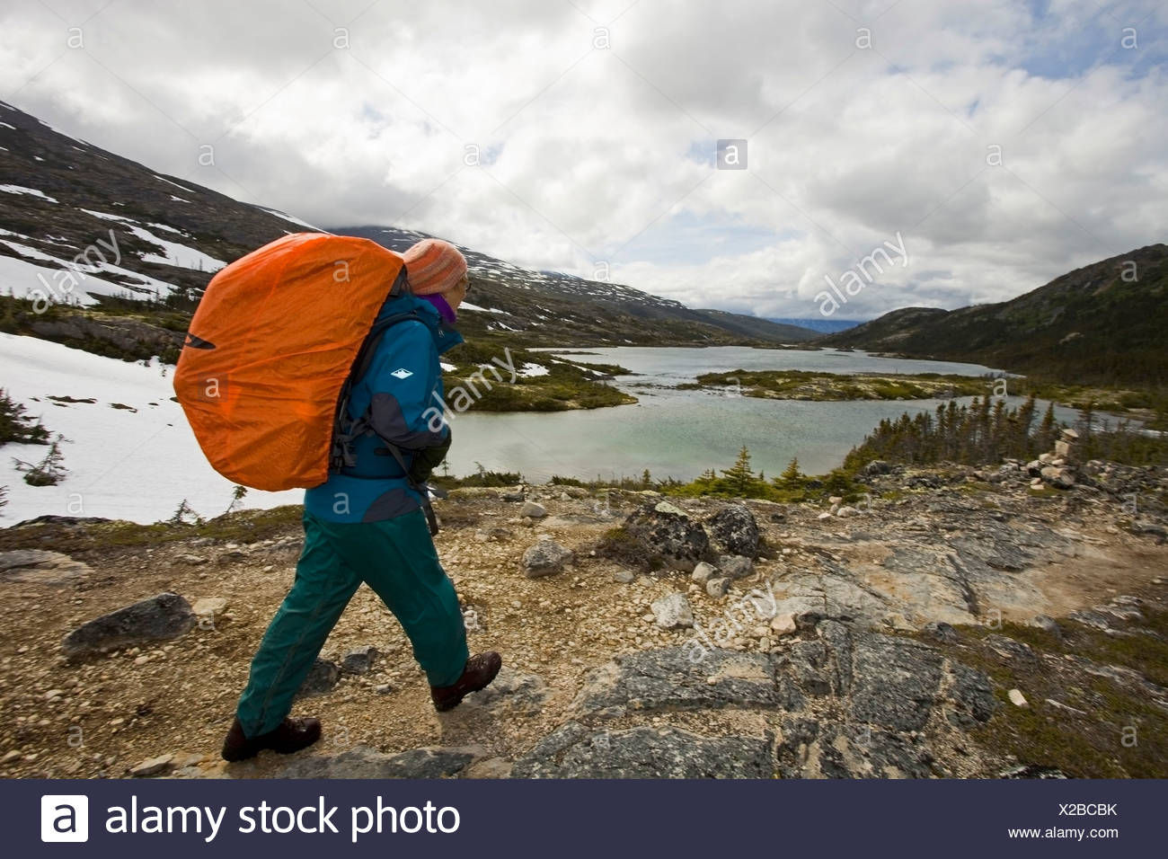 Lady Backpacker On Trail With Mountain Peak Behind Stock Photo