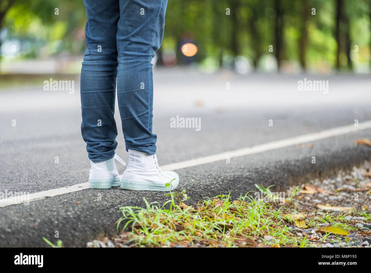 Close Up Foot Of Woman Backpacker Standing On Countryside Road With