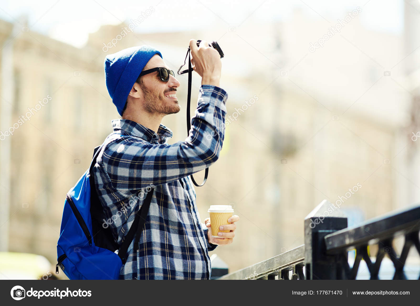 Modern Backpacker Photographing City Views Stock Photo