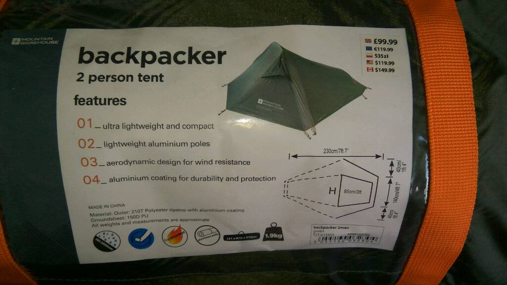 Mountain Warehouse Backpacker 2 2 Man Tent Just 1 9kg Brand New
