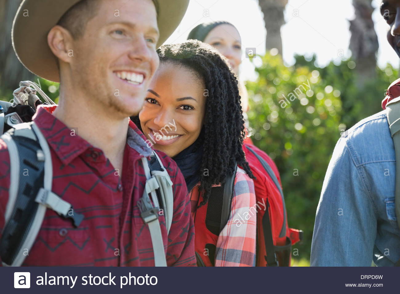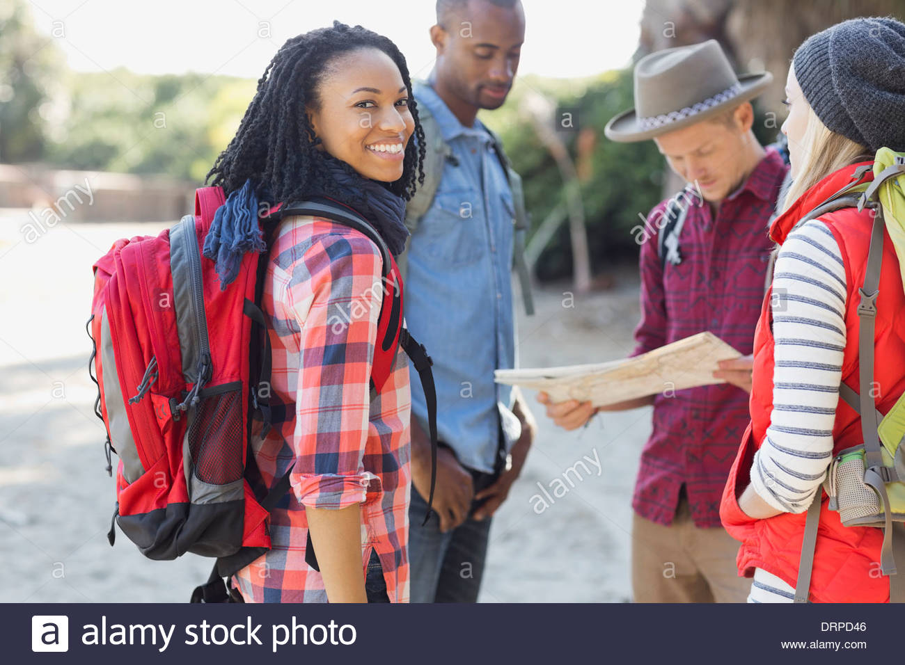 Portrait Of Female Backpacker With Group Of Friends Stock Photo