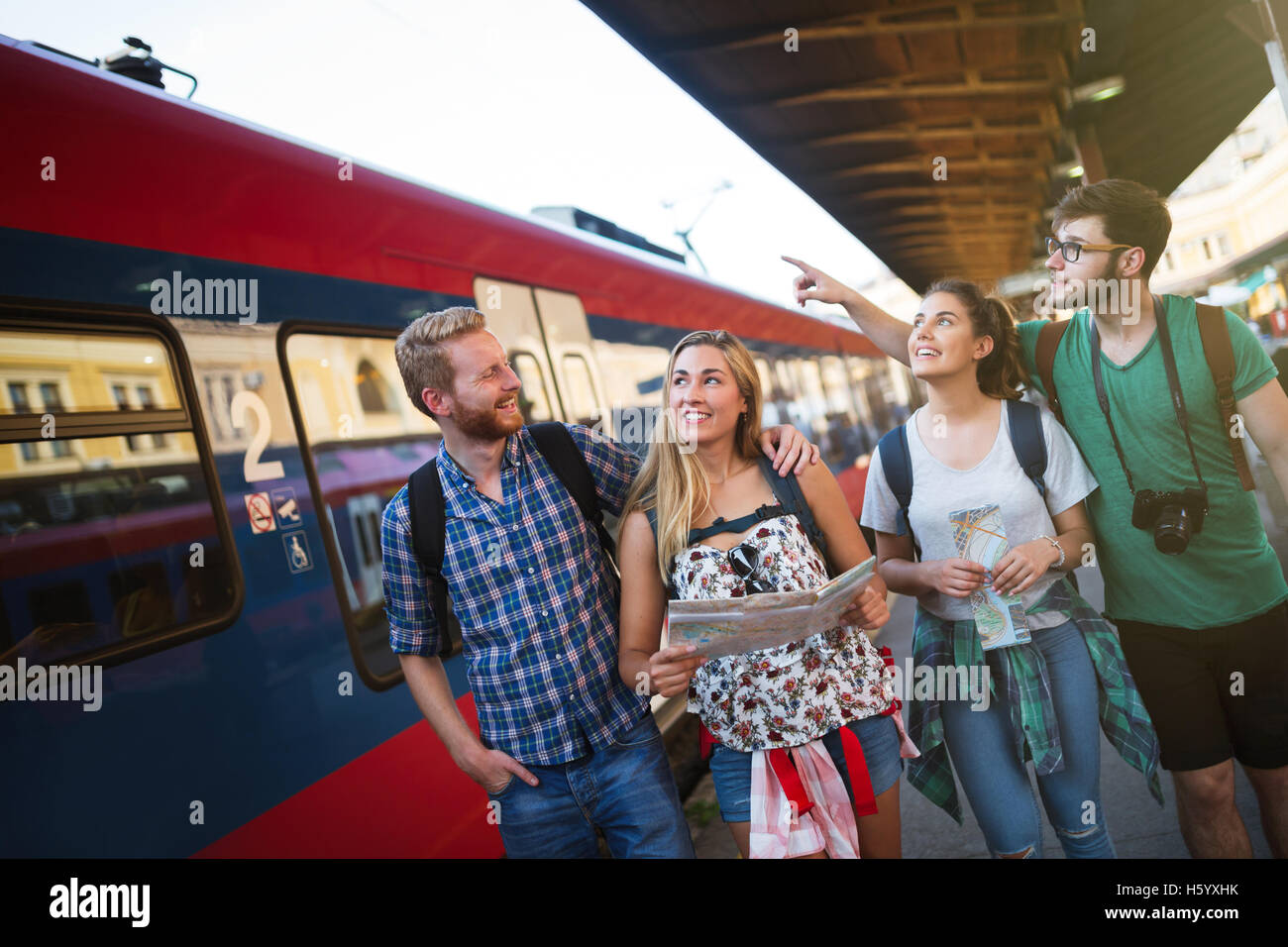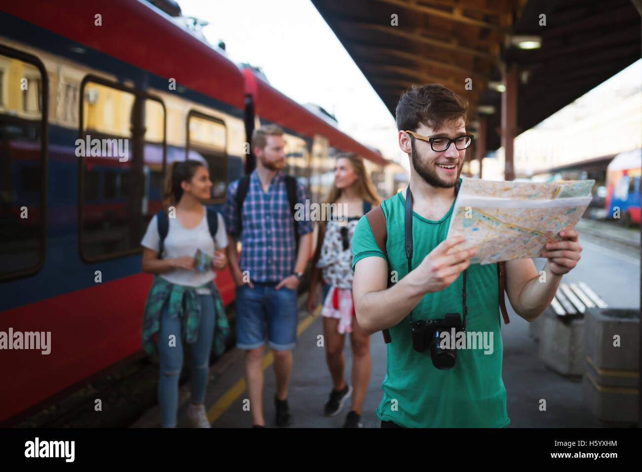 Traveling Tourist Backpacker Friends Exploring Europe Stock Photo