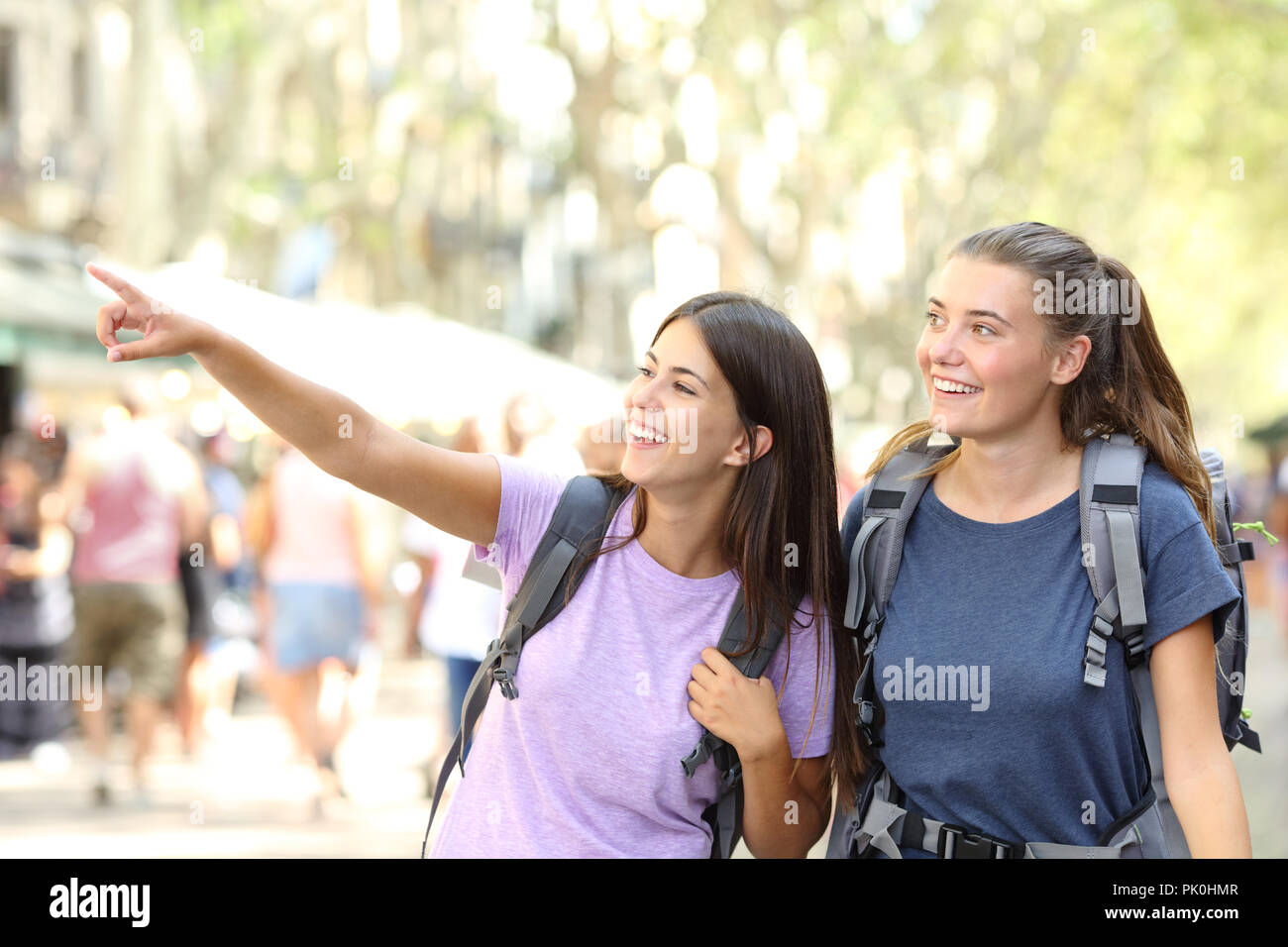 Happy Backpacker Friends Sightseeing And Pointing Landmarks In The