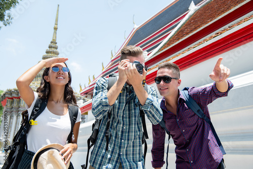 Group Of Young Tourist Backpacker Friends At Temple In Bangkok